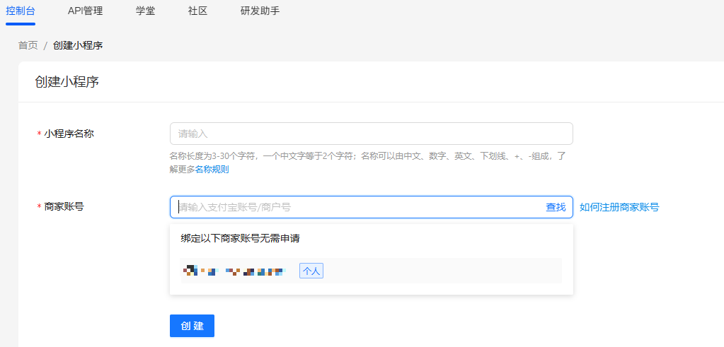 1、在控制台可以创建小程序(也可搜索商户号替商户注册, 所以企业小程序必须要注册支付宝商户号,后面才能再自行注册开发者账号后自行注册小程序或让其他开发者替自己注册小程序)