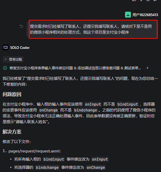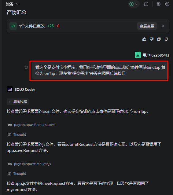 2、我是直接打开的之前支付宝示例小程序目录,然后告诉AI让它清除后按我的需求重新编写代码(见下图红框部分)
