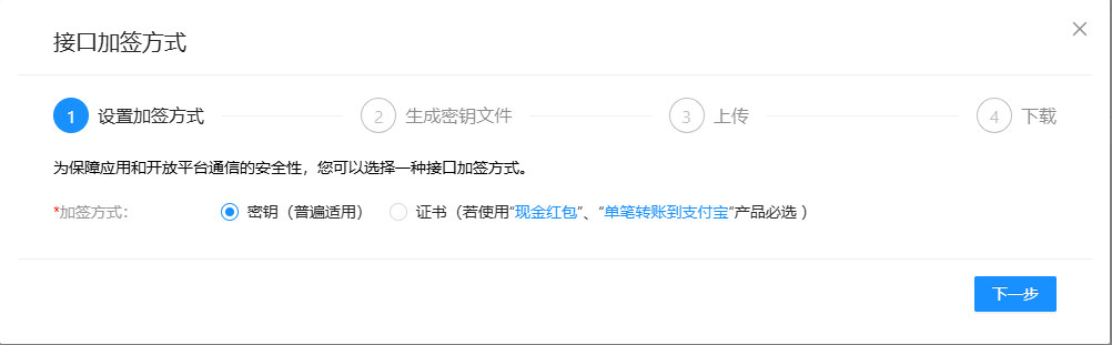 1、选择支付宝小程序,配置开发设置——接口加签方式(每个小程序各自用自己的密钥证书)