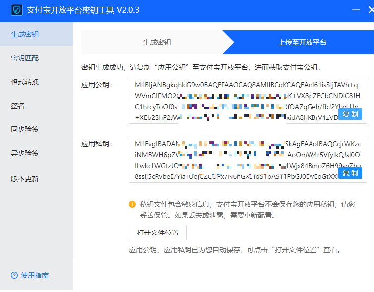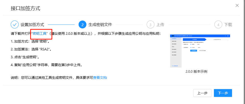 3、将上面生成的公钥,填写到第1步后面出现的“上传”应用公钥界面(需要短信验证)
