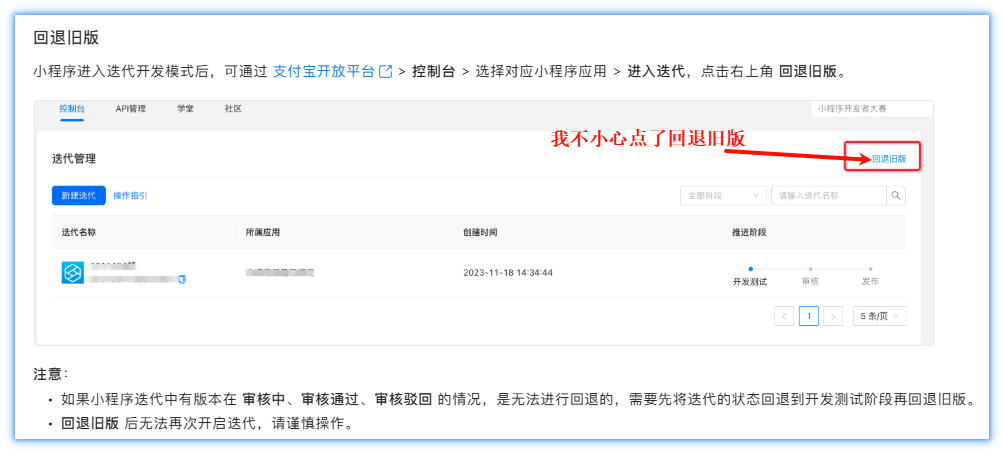 就在写本文的时候手动点了“回退旧版”,导致迭代开发模式没了,再也找不到迭代选项了,不过也好回退旧版后的发版流程感觉跟微信小程序差不多了(下图来自:一站式研发平台接入流程 – 支付宝文档中心)。