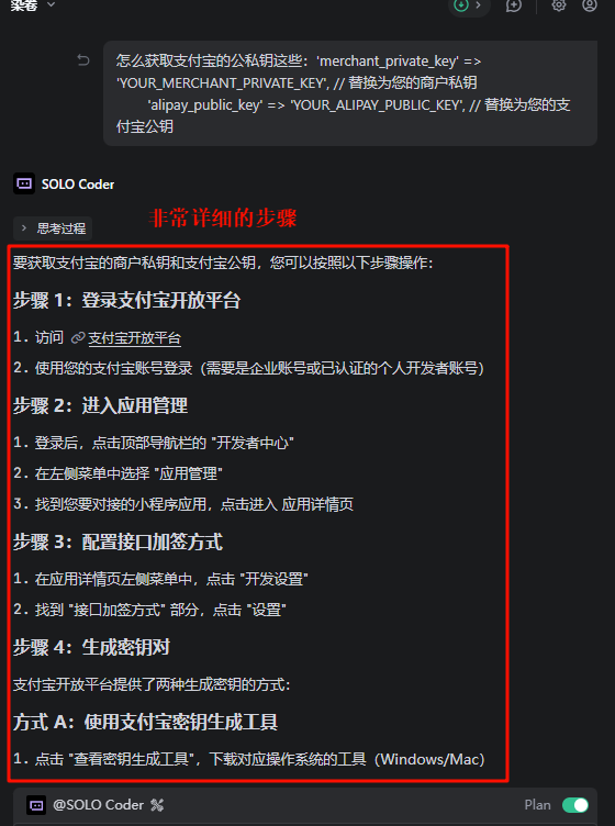 6、关于支付宝签名及密钥等问题,我也是第一次接触不知道怎么获得,但是这并不影响AI的发挥(直接问他就行),反正遇到什么问题、bug直接让AI解决即可。