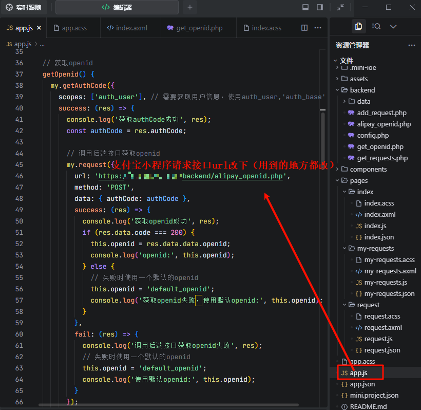 7、接口对接,AI生成的php接口文件在本地目录,我需要将文件上传到云服务器后,将支付宝小程序调研的接口地址进行修改,然后就完成前后端接口对接了。