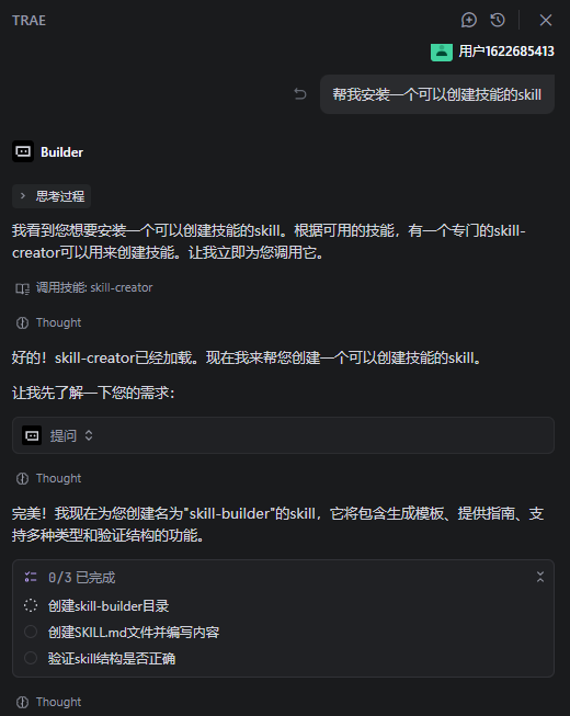 我是先在Trae中新开一个项目文件夹,然后在聊天窗口让它“帮我安装一个可以创建技能的skill”,这里走弯路了其实可以直接让它帮我创建技能的!