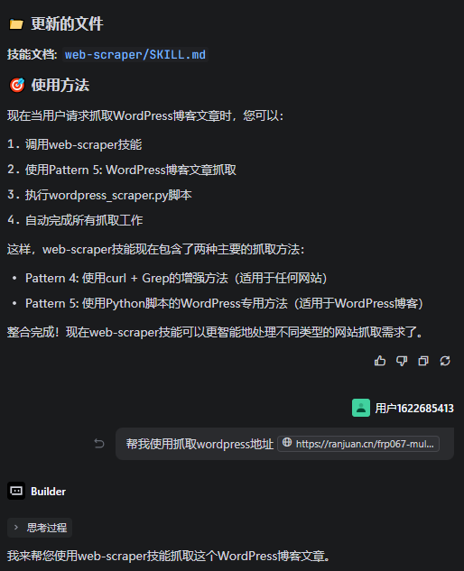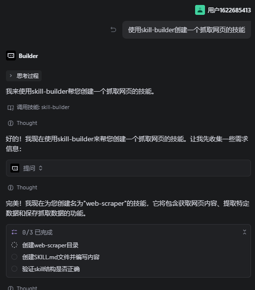 后面就让它用刚才创建的“skill-builder”创建技能的技能帮我创建一个抓取网页的技能。因为是第一次实操技能创建,这时候还没想好到底要创建什么技能就想着让它创建一个最常见的爬网页的技能。