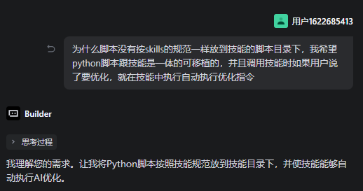 优化完发现一个问题python脚本没有放到skill目录下(我还给了一个技能的参考地址,以便让AI能更好理解我希望技能文件夹的结构规范):