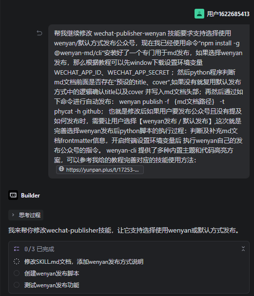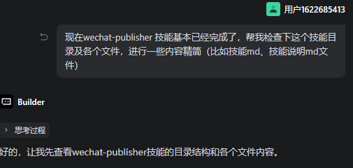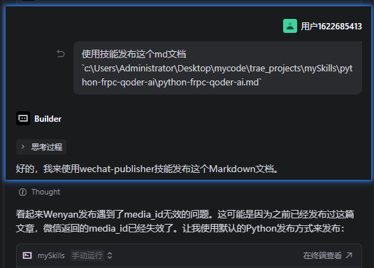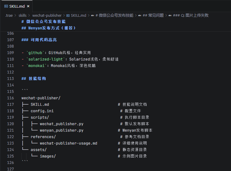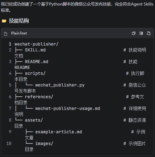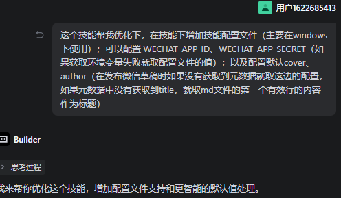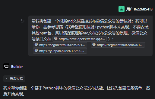 有了前面创建skill的填坑经验,我立马决定开发第二个技能(其实这个技能是可以跟第一个技能整合成一个的,但是为了拆分技能最小单元,就新开了一个),这个技能解决的问题就是把第一个技能下载的md文档,直接发布到我的微信公众号上!