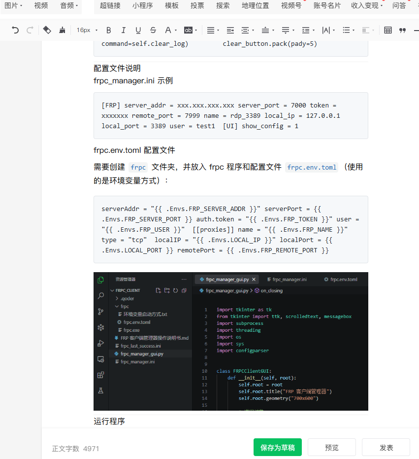这里也走了弯路,一上来我想着python脚本来实现,但最后发现排版没法看,可以说完全没有排版可言。创建时我直接给了一个在线教程地址及官方接口文档,实时证明AI 真可以凭借接口文档撸出程序逻辑的。
