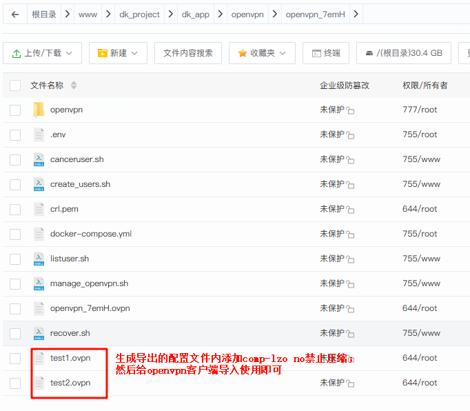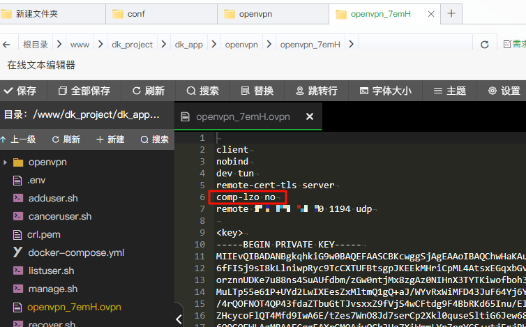 增加禁止压缩配置 comp-lzo no 保存后,就可以下载下来给openvpn客户端使用了。