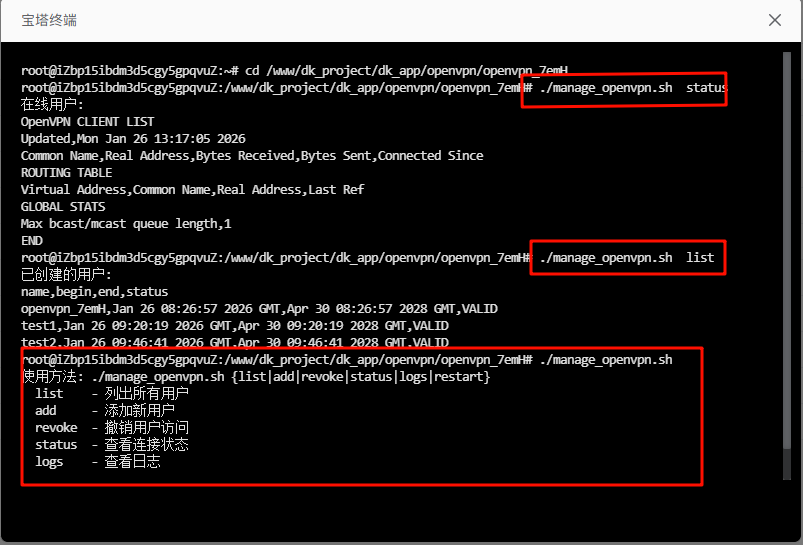 create_users.sh这个脚本会循环创建test1用户、test2用户(注意OVPN_DATA改成你实际的路径)。
