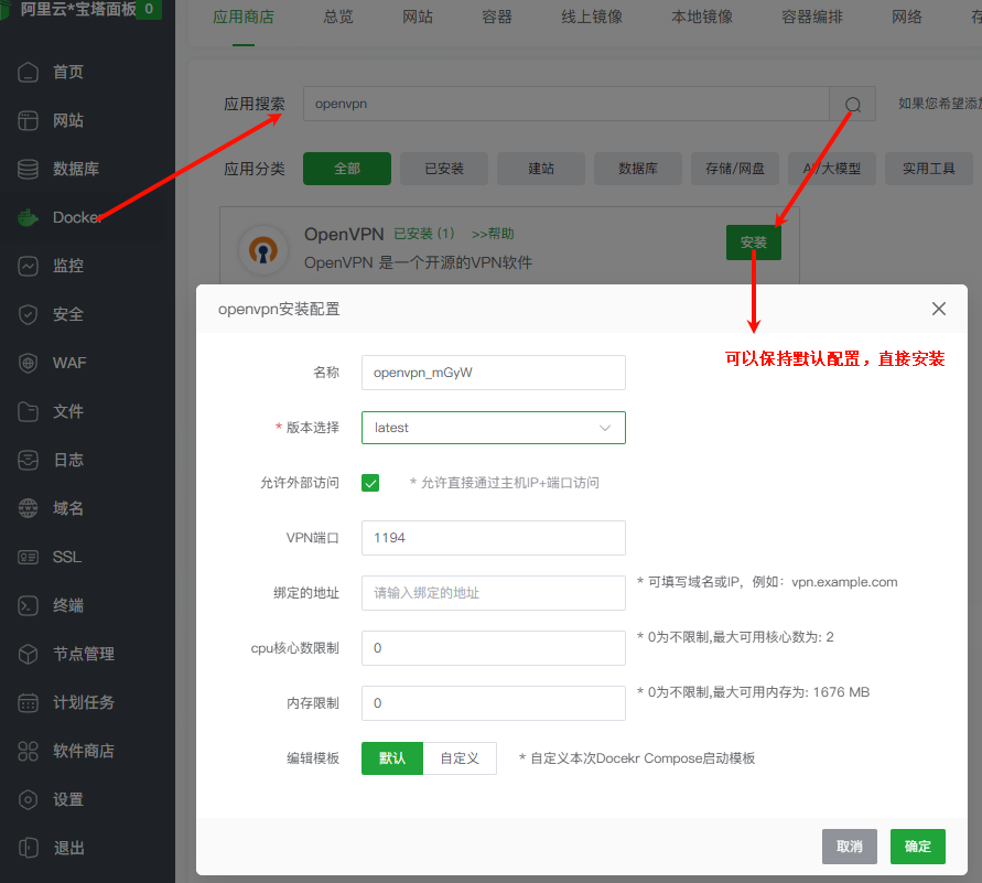 1、在宝塔Docker应用中搜索openvpn并进行安装。