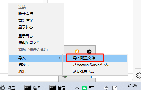 windows客户端打开软件后,在右下角托盘里面右键图标进行导入;导入成功后可进行【连接】。