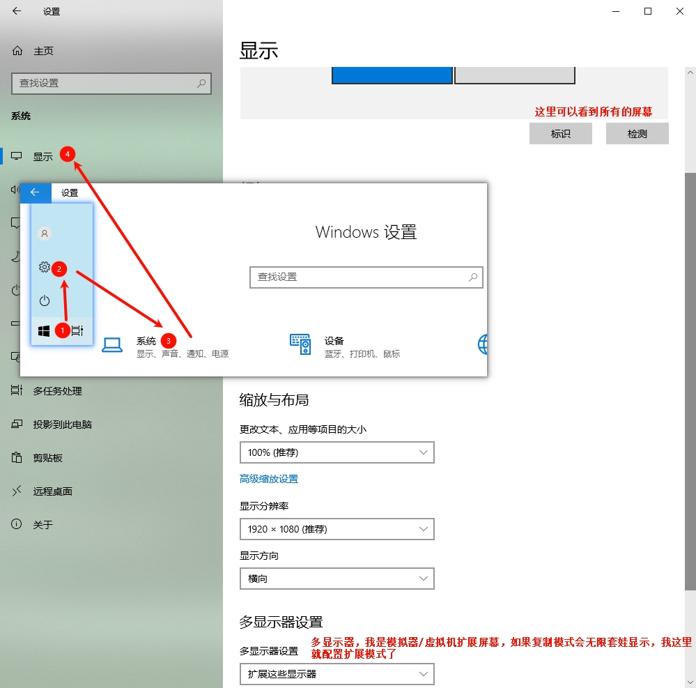 4、所有副屏连接完毕后,可以在主屏电脑系统设置中设置或检测多屏。