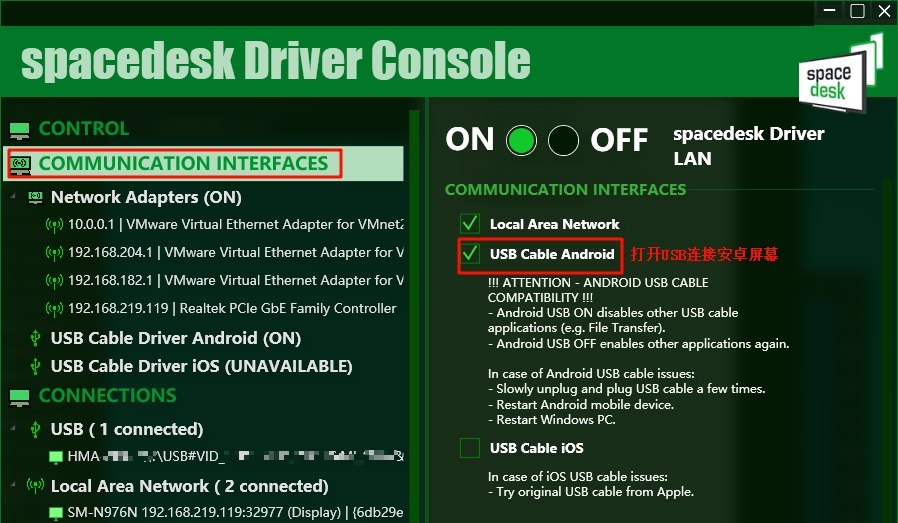 2、如果需要安卓手机通过usb连接电脑作为副屏,记得打开安卓usb开关。打开/关闭时屏幕可能会短暂黑屏。