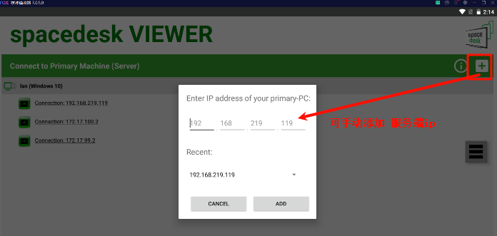 3、在安卓及windwos上安装客户端软件后,可以手动添加 主屏幕所在电脑ip进行添加(如果客户端无法自动扫描到主屏幕电脑ip的话)。我这里同电脑上安卓模拟器及虚拟机下都可以链接成功(手机添加的)。